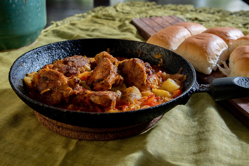 Boil the potato and skin it. Go back to your first deep pan. Into that add 1 and a 1/2 glasses of water. The residual masala will be the broth flavouring, set to simmer. Chop the onions and tomato. Also chop the boiled potato. Add the chopped onions, tomatoes and potatoes to the broth and let it all simmer. Next slow push in the chicken pieces and let all of the gravy mildly thicken.